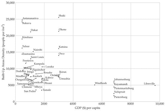 On the global scale, the population densities in built-up areas of a given country depend on its income class []. Figure 11 shows that a similar relationship is observed across our case studies. The density of urban areas located in higher income countries—such as Johannesburg, Pietersburg, Nelspruit, Libreville, or Windhoek, do not exceed 6000 people per km. On the contrary, higher densities are observed in lower income countries, especially in urban areas constrained by their natural environment (Dakar, Antananarivo, Bukavu, Kinshasa). On average, the density in low and lower-middle income urban areas is 12,295 people per km, whereas it is only 4348 people per km in upper-middle income countries. Likewise, population size seems to affect the observed densities: large and medium-sized urban areas are, on average, 64% more dense than small urban areas.