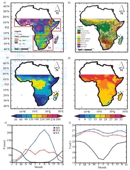 (a–d) The administrative boundary of Continental Africa: (a) topography at 30 m resolution acquired from a Shuttle Radar Topography Mission (SRTM) digital elevation model (DEM) of the National Aeronautics and Space Administration (NASA) []; (b) 2016 land use land cover (LULC) map at a 20 m resolution acquired from the European Space Agency Climate Change Initiative (ESACCI) (see Table 1 for details) []; (c,d) spatial distribution of annual average Climate Hazard Group Infrared Precipitation with Stations (CHIRPS) P and ERA-5 T over the period 1981–2017. (e,f) Multi-year (1981–2017) (e) precipitation (P) and (f) temperature (T) averaged monthly.