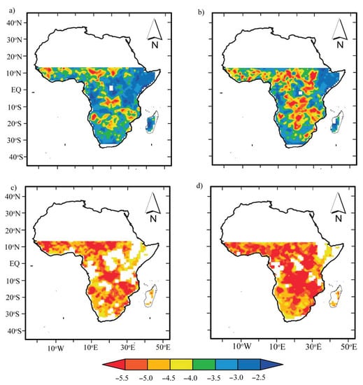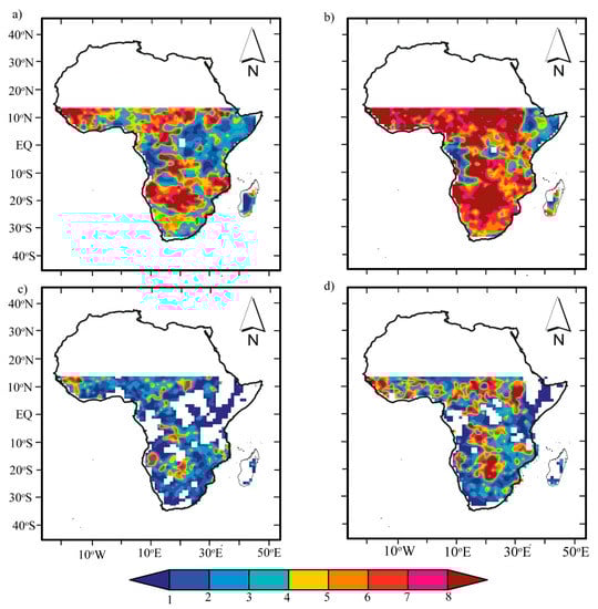 To analyze the drought intensity over the same across the SSA, the annual mean intensity was computed. Figure 3 shows maps of the mean annual drought intensity between the moderate (top panel) and extreme (bottom panel) drought events for both scPDSI datasets. However, scPDSITH shows more intensification and a larger affected area than scPDSIPM. Figure 3a,b present spatial intensity for moderate droughts with a similar spatial pattern and magnitude, as in Figure 2a,b. The results show that locations with high (low) intensities but extreme droughts are more intensified in scPDSITH relative to scPDSIPM (Figure 2c,d).