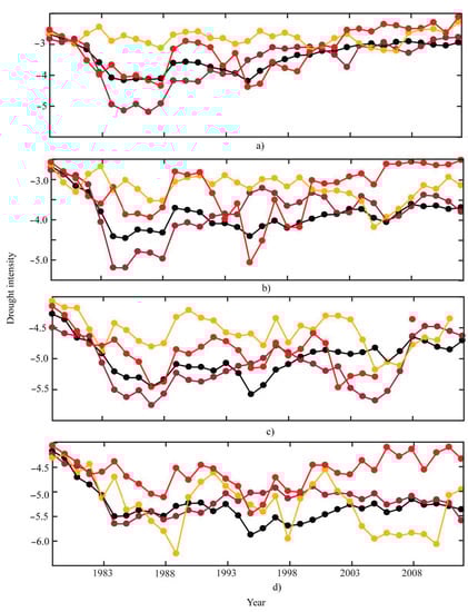 Next, the relationships between drought intensity and frequency were compared (Figure 5a,d). The temporal changes in drought intensity show opposite trends relative to frequency in both datasets (Figure 5a,d). Moderate drought shows more intensification than extreme droughts from 1995 onwards (Figure 5c,d). However, similar to the interannual variations in frequency, there is considerable disagreement in the interannual variations between the scPDSI datasets, especially after 1995. Similarly, more (less) frequent droughts have low (high) intensity. Thus, our results are consistent with previous regional studies, where the Thornthwaite method is reported to exaggerate drought frequency and intensity [,].