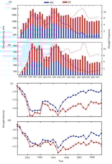 The relationship between drought frequency and areal coverage was investigated. Figure 6a,b show the interannual variation in frequency (shown as a line graph) and affected areas (shown as bar graphs) under moderate and extreme droughts. The frequency and area affected by droughts varied considerably (Figure 5a,b). This result was also reflected in Figure 6c in the temporal changes in drought intensity, but an opposite trend was found. This relation is expected, as drought intensity is related to frequency of occurrence. However, considerable disagreement was found after 1995, where both dataset estimates affected areas differently. scPDSIPM followed an opposite trend relative to scPDSITH, which is consistent with previous regional studies where the Thornthwaite method exaggerated drought frequency and intensity and hence drought-affected areas [,].