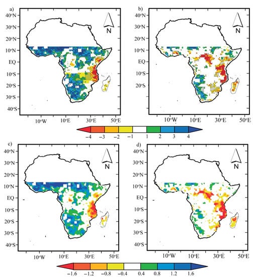 A comparison between the characteristics of the two drought datasets (scPDSIPM and scPDSITH) was made to understand how they represent trends in the wetting and drying conditions across SSA. Figure 6 shows the spatial distribution of linear trends for scPDSIPM and scPDSITH on a per-pixel basis over the period 1979–2012, estimated based on the M–K and Sen’s slope estimator. Figure 6a,b show trends of wet–dry variation from the M–K test, and Figure 6c,d show the direction of the trend based on Theil–Sen’s slope estimator.