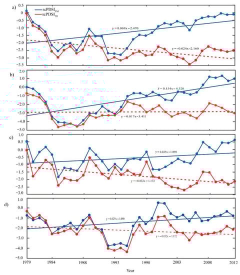 Regional trends for scPDSIPM and scPDSITH in (a) Sub-Saharan Africa (SSA), (b) the Sudano-Sahelian–Guinean coast (SSG), (c) the Horn of Africa (HoA), and (d) the Southern Africa region (SAR) over the period 1979–2012. A positive value indicates a wetting trend, and a negative value indicates a drying trend with solid blue and red dashed lines.