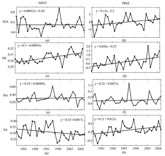 Interannual variation of P (mm yr−1) and NDVI anomalies in SSA and three regions from 1982–2012. The solid lines indicate linear fits from 1982–2012. (a,b) Sub-Saharan Africa (SSA), (c,d) the Sudano-Sahelian-Guinean coast (SSG), (e,f) the Horn of Africa (HoA), and (g,h) the Southern Africa region (SAR).