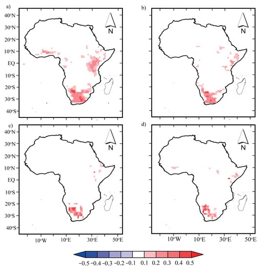 Pixel-wise correlation coefficients between seasonal mean scPDSI with the seasonal mean P anomalies in SSA for period 1982–2012: (a) MJJASO scPDSIPM and P anomaly, (b) MJJASO PDSITH and P anomaly, (c) NDJFMA scPDSIPM and P anomaly, and (d) NDJFMA scPDSITH and P anomaly. The shaded areas denote areas where the statistical tests were significant at the 5% level, and areas that are not significant at the 5% level are masked out (white shading).