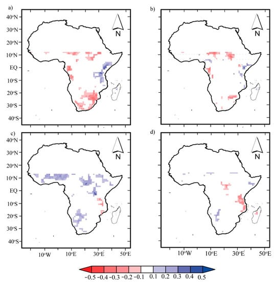 Last but not least, previous studies have attempted to link drought episodes to climate circulations (see [] in the case of the USA). Regarding SSA, both Sheffield [] and Katchele [] mentioned that studying the links between droughts and teleconnections is useful but remains a key challenge. We performed pixel-wise correlation to understand the temporal dynamics (Figure 10). The result showed that ENSO and IOD have a significant impact on wet and dry spells and that their geographical impact is consistent with that of P and NDVI anomalies. Despite weak correlation values, this result agrees with similar studies linking drought episodes to ENSO and IOD in Africa [,]. A negative (positive) correlation is associated with strong La Niña (El Niño) events, enhancing (reducing) P and hence wet (dry) spells. Similarly, IOD, as a coupled ocean–atmosphere mode, indicates a negative (positive) phase described by cool (warm) SSTs and impacts drought episodes in places consistent with ENSO but in an opposite phase (Figure 10c,d, bottom panel).