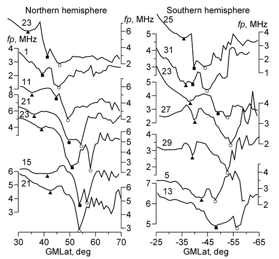 Latitudinal fp profiles in the Northern and Southern hemispheres for the CHAMP passes indicated in Figure 1. The minimum of each trough is marked by corresponding symbol.