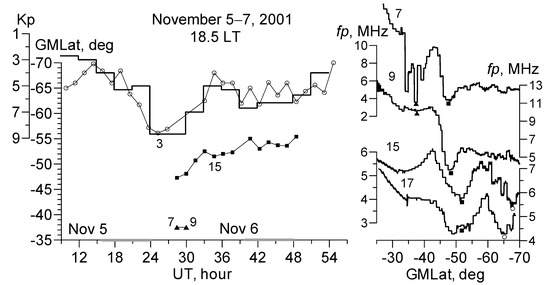 The CHAMP recorded the ionosphere response to another severe magnetic storm of 5–7 November 2001, when the Kp-index reached 9− and the Dst minimum was −272 nT. The most interesting manifestation of this storm was observed in the evening sector of the ionosphere in the Southern hemisphere. The variations in the trough positions for 18.5 LT are shown in Figure 4. The quality of the CHAMP data during this storm was worse than usual; however, this did not interfere with the analysis of the ionosphere structure. The storm pattern in the evening sector was quite simple. The MIT, in general, tracked the variation in the Kp-index without high delay, as the disturbance developed slowly. The RIT appeared during the main phase of the storm, at latitude of −47.5°. Once formed, the RIT was observed alone for a while. At the latitudes of the MIT model, a distinct trough was not detected, as passes 7 and 9 in Figure 4 (on the right) show. As the recovery phase of the storm developed, the RIT, as usual, shifted to the latitudes of the residual ring current, 53–55°. It was clearly expressed throughout the whole time, as shown on all passes in Figure 4 (on the right). The most interesting feature of the storm was the formation of a prominent structure at latitudes around 40° on pass 7. The Langmuir probe at these latitudes was certainly influenced by a strong interference, as significant variations in the electron density were observed. A deep trough at latitudes of 35–40°, however, was revealed very clearly. On the next pass (9), only a shallow minimum fp remained; this is also indicated in Figure 4 (on the left). Note that the RIT and LLT appeared during the storm maximum at longitudes with high values of the geomagnetic field. On pass 15, a peak of the electron density was recorded, which may also be part of the perturbed structure. On pass 17, the MIT can be clearly determined. The wide RIT, with irregular bottom, was located equatorward. Therefore, its position (in Figure 4 on the right), was at a latitude of 52°, which corresponds to the middle of the wide trough.