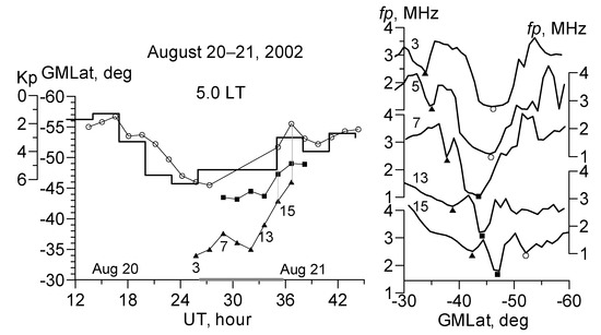 The storms discussed above were extremely strong. A question arises: Can a low-latitude trough develop during a less intense storm? To answer this question, the storm on 20–21 August 2002, with Kp-index maximum 6+ and the Dst minimum −106 nT, was considered. During this storm, the satellite was located in the sectors of 4.5 and 17.0 LT in the Northern hemisphere and 5.0 and 16.0 LT in the Southern hemisphere. The RIT was observed in all sectors of local time. The LLT was clearly recorded only in the 5.0 LT sector. This is why Figure 5 shows variations in the trough positions only in the morning sector in the Southern hemisphere. The storm had a clearly defined growth phase, which allows for accurate determination of the delay in the trough reaction, which was equal to 2 h. The squares in Figure 5 mark the cases that are clearly related to the RIT, as they were located at latitudes equatorward of the MIT model. The RIT was very clearly expressed on all these passes. The LLT appeared at an early stage of the storm recovery phase, again at longitudes with a weak geomagnetic field. It appeared very clearly on passes 3 and 5 at latitudes of −34° and −35° GMLat, respectively. Then, as the geomagnetic activity decreased, it shifted to higher latitudes; up to 46°. On passes 15 and 17, a complex structure was observed, in which three troughs can again be distinguished (see Figure 5, on the right). Thus, during a less intense storm, the LLT was clearly visible only in the morning sector and only in the Southern hemisphere, although the local time of observations in both hemispheres did not differ much.
