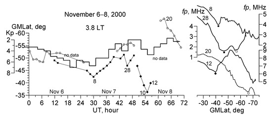 Analysis of the variations in the ionospheric structure during geomagnetic storms is not a simple task, as can be seen from the previous considerations. It is not always possible to clearly identify the ionospheric troughs or to understand their dynamics. First, it is not always possible to separate the MIT and RIT. Second, when the electron density at high latitudes is irregular, the MIT can be confused with the high latitude trough (HLT), which is located inside the auroral oval [23]. Conversely, at low latitudes, structures that can be confused with the RIT (or, even, the LLT) are sometimes observed. An example of such a structure, according to CHAMP data, was observed during the storm of 6–8 November 2000, in the Southern summer hemisphere. The dynamics of the trough for this storm in the morning sector (3.8 LT) are shown in Figure 6. The storm was quite strong, with the Kp-index reaching 7. The disturbance developed slowly, such that the MIT responded to changes in the Kp-index with little delay.