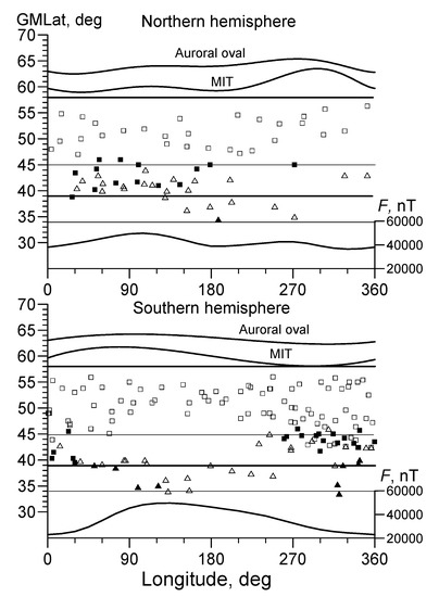 Figure 8 shows the variations in the RIT and LLT position with longitude in both hemispheres. The data are the same as in Figure 7; that is, for after midnight/morning conditions and for all Kp values. The cases of well-defined troughs at the early stage of the recovery phase are shown by filled symbols, while other cases are shown by empty ones. There were also longitudinal variations in the geomagnetic field magnitude, F, at the geomagnetic latitude of 45°. To complete the scheme, the variations in the MIT position [22] and in the position of the equatorward edge of the auroral oval (taken from [27,28]) are also presented. Both borders are defined for midnight.
