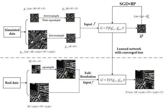 Deep learning technology is a training method with parameters. As shown in Figure 1, we represent the PAN image as  and the MS image of N bands as . According to the Wald protocol [], the MS and PAN images are sampled up and down, respectively, obtaining the degraded images  and  to form the input data . Through deep network training, the prediction loss between the generated image  and the reference image  is minimized, and the final data model is obtained. Finally, in the testing phase, the trained data model is used to reconstruct the input real data  to generate HRMS images .