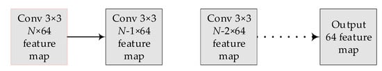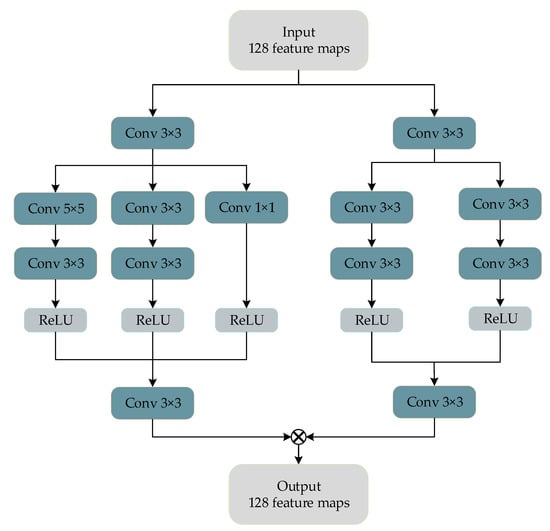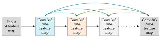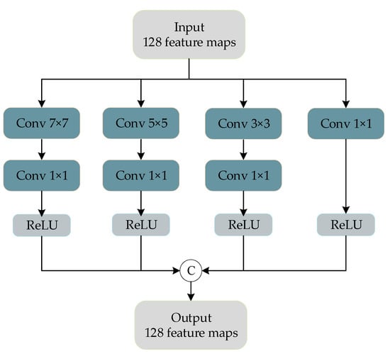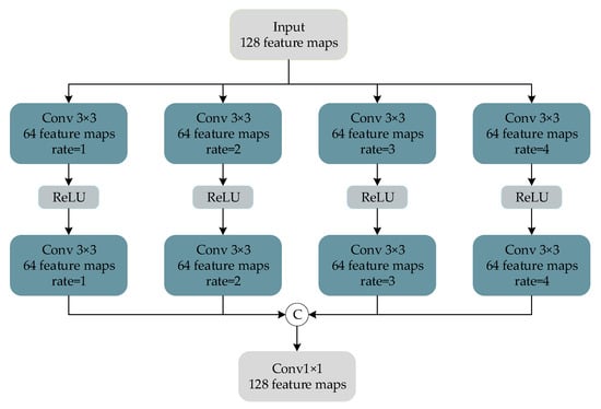 We follow the experimental setting of Fu et al. [] and set the dilation rate of the dilated convolution block to 1, 2, 3, and 4. The magnitude of the receptive field of the convolution kernel of the dilated convolution is , where d represents the dilation rate, and k represents the size of the convolution kernel. In the parameter setting, the size of the standard convolution kernel and the dilated convolution kernel are both , the activation function is ReLU, and the number of filters is 64. In addition, after the dilated convolution of each layer, a convolutional layer with the same dilation rate is added to further expand the receptive field. Finally, a convolution layer of size  is used for dimensionality reduction to reduce computing consumption.