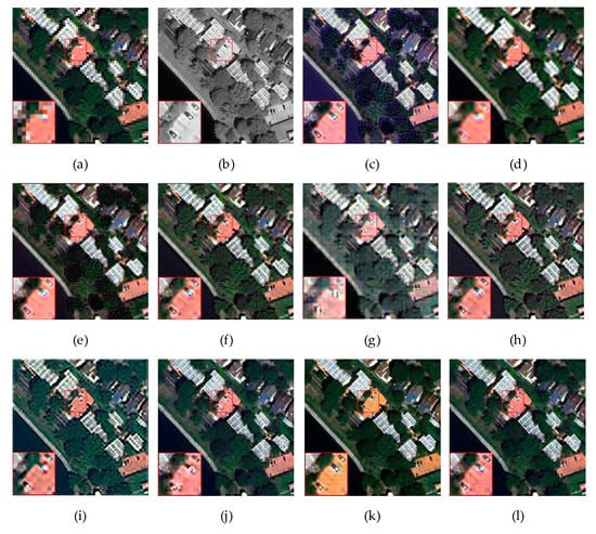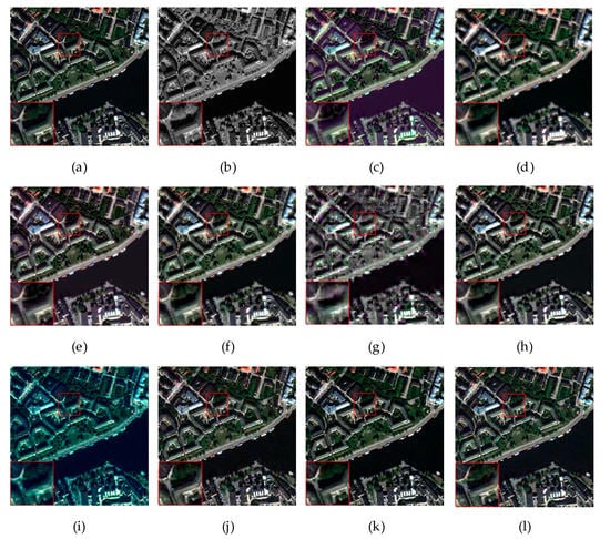 Figure 9 shows a set of fusion results on QuickBird satellite data with a dataset of 4-band images. Figure 9a,b show HRMS and PAN images with resolution, Figure 9c–i represent seven non-deep learning pan-sharpening methods, and Figure 9j–l represent deep learning methods.