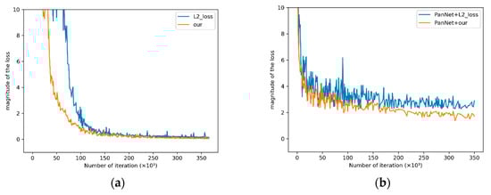 Figure 12 shows the convergence process of L2 loss function and the loss function proposed in this paper on the training set. Table 7 shows the objective evaluation indexes of fused images obtained by different loss functions. The network structure proposed in the paper and the PanNet network structure are used to test the convergence of the loss function. Figure 12a shows the convergence effect of the loss function proposed in this paper of MDECNN, and Figure 12b shows the convergence effect of the loss function proposed in this paper on the network structure of PanNet. The convergence positions of Figure 12a,b indicate that the new loss function training network converges faster and has a better final convergence effect than L2 loss function. At the same time, Table 7 shows that the fused images obtained by the new loss function are more in line with expectations. Meanwhile, by comparing the convergence images in Figure 12a,b, it can be seen that the error fluctuation in Figure 12a is small, indicating that our network structure is more stable and has better convergence effect than that of PanNet. Combined with the results in Figure 12 and Table 7, the proposed solution of the comprehensive loss function is shown to be obviously superior to the general solution of spectral loss L2.