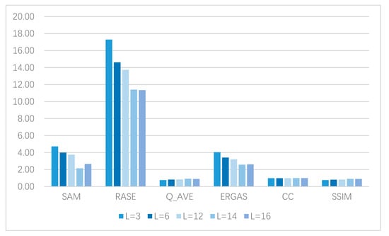 Setting of encoding network parameters We also test the influence of encoding network depth. Specifically, we fix the other module parameters, and then we set the encoding network depth to L= {3, 6, 12, 14, 16} for verification. The model is trained by using the coding networks of 3, 6, 12, 14, and 16 dense-coded layers and the decoding networks of corresponding layers to obtain the corresponding fusion images. Meanwhile, objective evaluation indexes are used to observe the visual statistics on the results, and the quantitative results are shown in Figure 13.