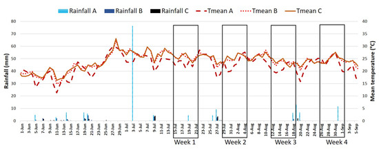 Diagram showing rainfalls and temperatures for the 3 locations in relation with measurements periods (week 1 to 4). Tmean refers to the mean temperature for each plot.