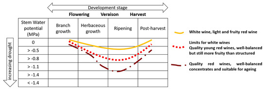 A moderate hydric deficit is essential to ensure vigor of vineyards and to get both high yield and quality of vineyards [1,2]. This is needed to restrict vegetative development and foster the growth of berries, especially between the fruit set and veraison [3]. From veraison to harvest, the optimal water status depends on the desired type of wine. Without water restriction, the produced red wine will be herbaceous, diluted, and acidic, whereas a severe deficit will result in red wines that are excessively tannic, hard, astringent, and alcoholic [3].