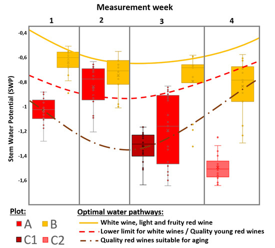 Figure 7 provides the temporal evolution of SWP with respect to the three optimal pathways presented in Figure 6. SWP values for plot B are almost totally included between the first two curves (i.e., plain yellow line and dashed red line, respectively), which means irrigation was well controlled to produce a white, light wine (Figure 6) and fits with the data gathered on the amount of distributed water (Table 2). Regarding plot A, SWP values are included between the two lower curves (i.e., dashed red line and dash and dotted brown line), except for the second week, possibly in relation to the breakdown of the irrigation system mentioned in Table 2, which led to an overflow of water in the plot. SWP for plot C2 ended up below the lower curve (i.e., dashed and dotted brown line), reflecting the important water stress that occurred during the last week in accordance with the lack of an irrigation system for red varieties.
