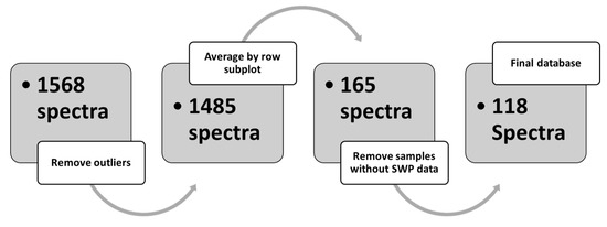 - The last step of preprocessing consisted of checking all spectra to remove outliers according to their reflectance values especially the ones that had a low reflectance level due to measurement error. Spectra were then averaged by row subplot. Samples without SWP measurements for the considered date were also removed from the database (e.g., data for plot A and week 4, as mentioned in Table 3).