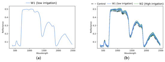 Leaves’ spectra acquired on 23 August 2019 in plot B (SWP mean value for this date: control = −1.2 MPa, W1= −0.80 MPa, W2 = −0.65 MPa). (a) Example of one spectra of a row subplot for W1 irrigation; (b) all spectra for each row subplot of the three irrigation areas.