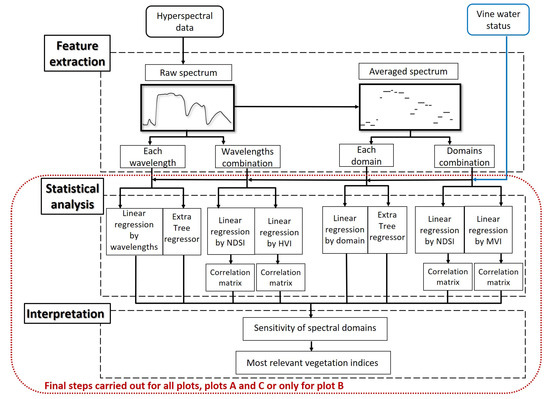 The methodology implemented in this study is summarized in Figure 10. Details of data acquisition are described in the previous section. Each statistical analysis and interpretation is carried out for either (i) all the data at the same time (n = 118), (ii) by grouping plots A and C (n = 59), or (iii) taking only plot B (n = 59). This allows us to maintain continuity in the measurements and a consistent range of stem potential values for each week and each water pathway (Figure 7). The first step of processing consisted of extracting features from leaves’ measurements from both (1) the raw spectra (Section 3.1.1) and (2) spectra that were averaged by wavelength domains (Section 3.1.2). The features retrieved were (a) the reflectance values for each independent wavelength or the average reflectance value for each wavelength domain and (b) the mathematical combination of reflectances at several wavelengths or for several domains.