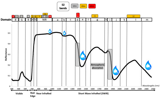 For instance, the main water absorption in the short-wavelength infrared, located around 1.2, 1.4, and 1.9 µm, were used to define the three domains SWIR b, e, and j, respectively. Additional constraints were also taken into account, especially to ensure compliance with Sentinel-2 bands (e.g., Red-Edge_a and _b related to S2 Red-Edge bands 5 and 6, respectively) and to avoid atmospheric absorption. Table 6 synthesizes the wavelength range associated to each wavelength domain.