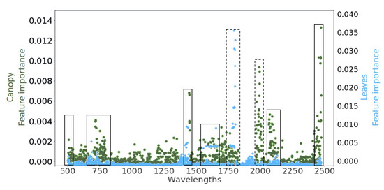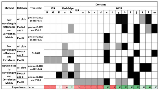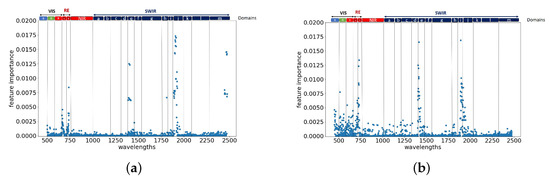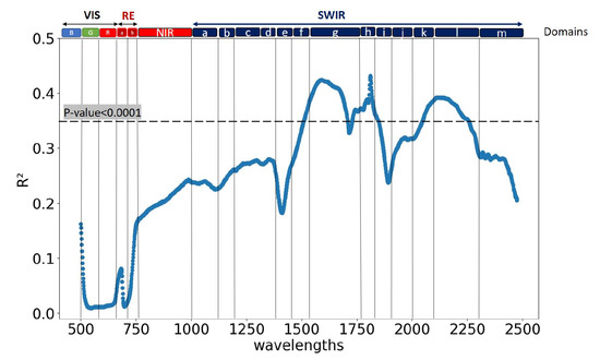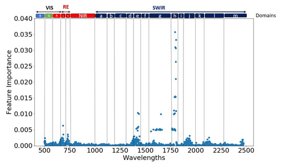 From the database presented in Section 2.3.2, one cannot find any obvious difference in spectra, as their main variations in reflectance are related to the global shapes of major vegetation absorption (e.g., [41,42]) and not to differences in SWP/water stress (e.g., Figure 9). Among the many existing remote sensing processing techniques (e.g., [43,44]), we chose to focus on highlighting the most significant domains related to vine water status. Indeed, the final goal is to verify whether it would be possible to use multispectral data to monitor vine water status; meaning checking which domains and, therefore, which spectral bands are needed.