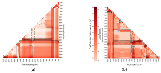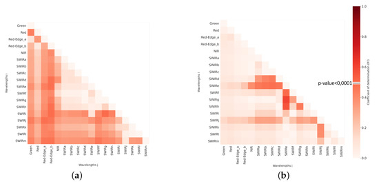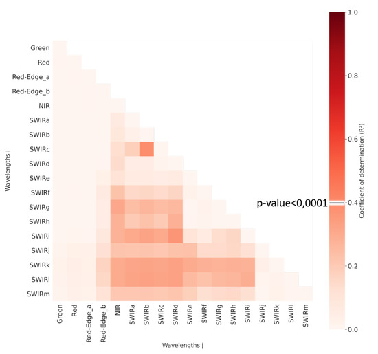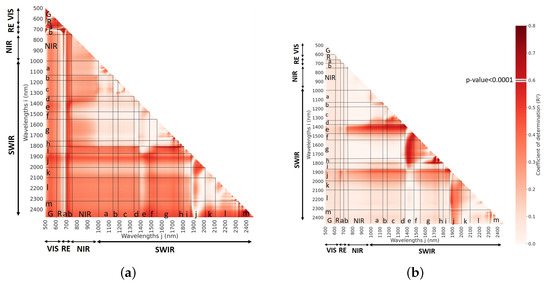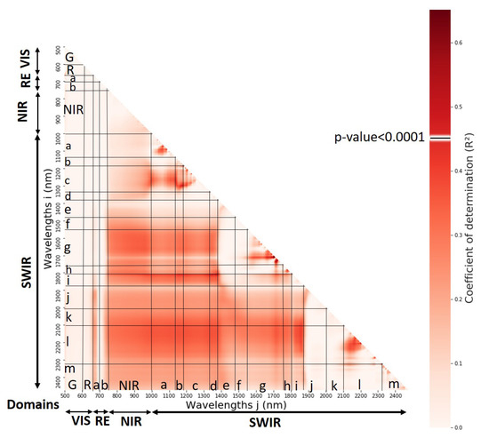 - In the case of NDSI, a feature data set is constructed using two-wavelength combinations ([46,47,48]) in following the formula:where Ri and Rj refer to the reflectance values at λi and λj, respectively. This way, each possible combination of wavelengths over the whole spectrum was systematically tested. This approach allows us to normalize the reflectance and provide a clear overview of the most significant wavelengths. The spectral domains are directly highlighted in the correlation matrix (see Section 3.2.1). Several studies demonstrated that NDSI often performs better than common published indices [49,50].