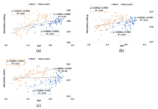 As in Section 3.1.1, the first kind of analysis focused on the search for a direct correlation between the averaged reflectance for each domain and SWP. Then, two types of mathematical combinations were tested: (1) the Normalized Difference Spectral Index (NDSI) and (2) the existing Multispectral Vegetation Indices (MVI):
