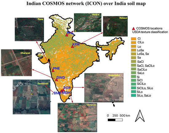 Location of the Indian COSMOS Network (ICON) sites. Indian Map is overlayed with the soil texture map of India (NRSC) where Cl-Clay, Lo-Loam, Sa-Sand, Si-Silt. Photos show the precise location inside the google-earth maps with a 50 m and 200 m impact area.