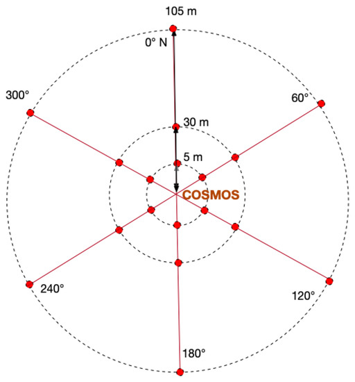 Soil sample strategy for the calibration of the COSMOS sensors. Sampling locations are marked with red circles.
