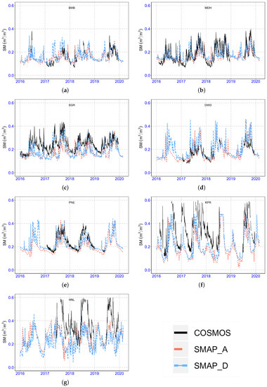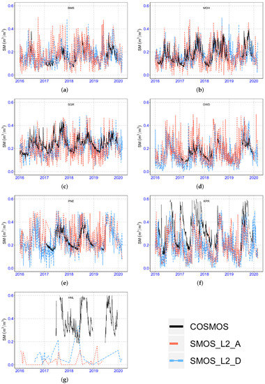 - Colliander, A.; Jackson, T.J.; Bindlish, R.; Chan, S.; Das, N.; Kim, S.B.; Cosh, M.H.; Dunbar, R.S.; Dang, L.; Pashaian, L.; et al. Validation of SMAP surface soil moisture products with core validation sites. Remote Sens. Environ. 2017, 191, 215–231. [Google Scholar] [CrossRef]