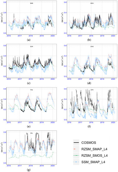 6.1. Surface and Root-Zone SM versus COSMOS Measurements