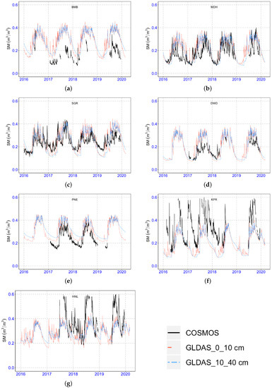 Global Land Data Assimilation System (GLDAS) is generating optimal fields of land surface states and fluxes, by combining satellite and ground based observational data products using advanced land surface modeling and data assimilation techniques [51]. The forcing into the models are from Princeton meteorological forcing input data and provides data from 2000 till present. In the current study, GLDAS_Noah version 2.1 products were downloaded from the NASA EARTHDATA webportal. The product is off-line (i.e., not coupled to the weather model) and it is a gridded 1D model (vertical fluxes only). GLDAS 2.1 includes three LSM: Noah-3.6, Community Land model(CLM-F2.5) and Variable Infiltration Capacity (VIC-4.1.2). The Noah-3.6 selected for this study, provides a full set of hydro-meteorological data including SM at 3 h time intervals over a regular grid at 0.25 spatial resolution (see Table 3). The model gives output in four soil layers, 0–10 cm, 10–40 cm, 40–100 cm and 100–200 cm. In this study, all layers were considered for the COSMOS data comparison separately and no further filtering is applied to the dataset. The data can be downloaded from website https://ldas.gsfc.nasa.gov/gldas/.