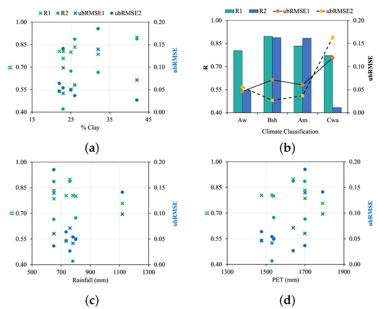 Performance Analysis of SMAP_L4 SSM and SMOS_L4 RZSM over the ICON sites with respect to % of Clay (a), Köppen Climate classification (b), Average yearly Rainfall (c), and Average yearly PET (d). R1 and ubRMSE1 corresponds to SMAP_L4 SSM and R2 and ubRMSE2 corresponds to SMOS_L4 RZSM which are the best performing products among SMAP and SMOS.
