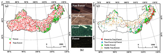 In addition, to assess the forest changes from 2007 to 2017, we conducted stratified sampling via four strata (i.e., stable forest, forest to non-forest, non-forest to forest, and stable non-forest) in the entire northern China. Then, the random samples were visually interpreted according to the VHR images from Google Earth taken circa 2007 and 2017. Finally, 558 stable non-forest samples, 334 non-forest to forest samples, 363 forest to non-forest samples, and 409 stable forest samples were obtained (Figure 5c).
