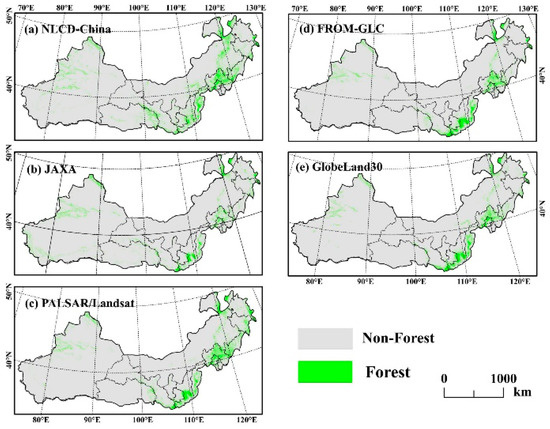 Figure 6. Forest spatial distribution derived from the PALSAR/Landsat-based forest map and other four forest products in 2010. (a) NLCD-China forest map; (b) JAXA FNF forest map; (c) PALSAR/Landsat-based forest map; (d) FROM-GLC forest map; (e) GlobeLand30 forest map.