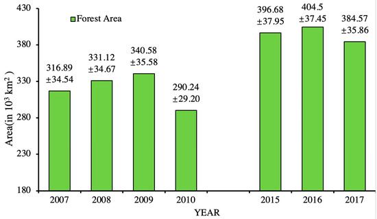 Based on the resulting forest maps in this study, the total forest areas in northern China were 316.89 ± 34.54, 331.12 ± 34.67, 340.58 ± 35.58, 290.24 ± 29.20, 396.68 ± 37.95, 404.50 ± 37.45, and 384.57 ± 35.86 thousand km2 in 2007, 2008, 2009, 2010, 2015, 2016, and 2017, respectively (Figure 8). The averaged forest area during 2015–2017 (395.25 thousand km2) was higher than that during 2007–2010 (319.71 thousand km2) (Figure 8). It is worth noting a remarkable decrease in the forest area of 2010, which could be related the rapid urban and industrial expansion [57]. In the 2015–2017 period, the forest area in 2016 peaked with a subsequent decrease in 2017. Moreover, the forest area in 2017 was smaller than that in 2015. We study the spatial distribution of forest gain, forest loss, stable forest, and stable non-forest between 2015 and 2017(Figure S2). Forest loss (2015–2017) occurred mainly in Northeast China. Northeast China is the most important wood production region and industrial area in China, so large-scale logging of trees for wood. Such a fact might not imply that part of the afforestation has been unsuccessful as the Three-North Shelterbelt Forest Program pays attention to the afforestation effect of the entire northern China.