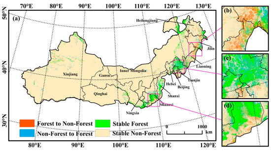 Figure 9. Spatial distribution of forest gain, forest loss, stable forest and stable non-forest in northern China (a) and three selected sub-areas (bd) from 2007 to 2017.