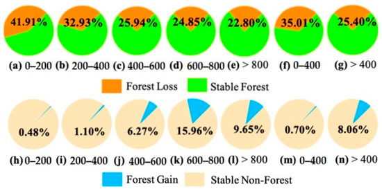 Figure 10. Forest changes (loss and gain) in different precipitation zones from 2007 to 2017. (ag) The ratio of forest loss (2007–2017) in the original forest area (2007) of different precipitation zones. (hn) The ratio of forest gain (2007–2017) in the original non-forest area (2007) of different precipitation zones.