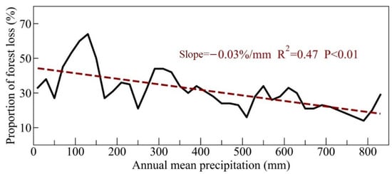 Moreover, a significant negative relationship between the ratio of forest loss and annual mean precipitation was found, with the slope of 0.03%/mm (p-value < 0.01 and R2 = 0.47) (Figure 11). That is to say, the forest loss proportion decreased from more arid zones towards more humid zones.