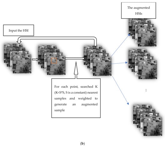 More recently, [17,18,19] described HS data augmentation techniques where pixels are grouped in blocks, and different block pairs are used as input to a convolutional neural network (CNN). In [20], the samples in the true dataset were shifted along its first principal component or based on the average value in each band. The augmentation based on randomly erasing parts of the input patches was also proven effective for HSI classification in [21]. Finally, generative adversarial networks have been proposed recently as a data augmentation technique to generate new samples mimicking the distribution of the true data [22,23,24].