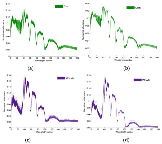 For comparison, we draw the true and augmented samples on the same figure. Figure 4 shows that the clustering degree of the new samples is better than that of the true test sample. Figure 5a,c are the 4th and the 14th true spectral reflectance of the Indian Pines data, respectively; Figure 5b,d are the augmented spectral reflectance of the Indian Pines data by the third iteration of algorithm 2, respectively.