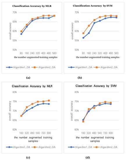 We use the data augmentation algorithm to generate the augmented training samples and calculate the classification accuracy. In the true HS data, we select different numbers of true training samples, namely, 80 true training samples (5 for each class), 160 true training samples (10 for each class). Figure 7a,b are the classification accuracy graphs with 80 true training samples (5 for each class). Figure 7c,d are the classification accuracy graphs with 160 true training samples (10 for each class). Two data augmentation methods are used to augment the training samples to N times, where the X-axis is the number of the augmented samples. To test the effectiveness of the data augmentation algorithm, we use two classifiers (MLR, SVM) for the experiments.