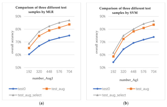 As shown in Figure 8, by using the same augmented training samples to train the classifiers, different test samples will produce different classification results. The classification accuracy of the augmented test samples is higher than that of the true test samples. The classification accuracy of the selected augmented test sample is the best.