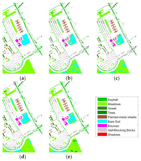 (2) The Pavia University data set was acquired by the Reflective Optics System Imaging Spectrometer sensor during a flight campaign over Pavia, northern Italy. This data set consists of 610 × 340 pixels, with a spatial resolution of 1.3 m per pixel. After 12 noisy spectral bands are removed, 103 spectral bands are retained in the experiments. The ground truth contains nine representative urban classes.