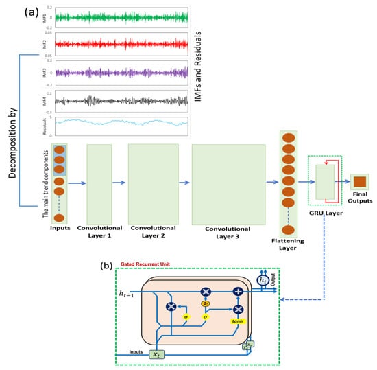 The hybrid CEEMDAN-CNN-GRU model utilises Gated Recurrent Unit (GRU) neural network as the predictive tool after extracting features based on the CNN algorithm (Section 2.1.1). GRU is a distinct type of long short-term memory (LSTM) network presented by Cho et al. []. Along with similarities, GRU possesses different characteristics from the LSTM. For instance, the GRU owns two gates, namely the update gate and reset gate, whereas the LSTM has three gates (i.e., the input gate, forget gate, and output gate). Figure 1 provides a schematic of the hybrid CEEMDAN-CNN-GRU model with CEEMDAN data decomposition and model architecture. Moreover, Figure 1b shows the structure of the gated recurrent unit network.