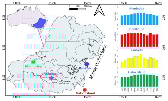 The geographical locations and physical characteristics of the sites in Murray Darling Basin are tabulated in Table 1. It should be noted that the site Gabo Island is located at the border of the MDB region for comparison purposes with the other study stations, whereas ~20 lakes surround Menindee in a harsh desert environment. The site Fairfield lies within the savannah climate class with land-use patterns of dryland cropping []. Figure 2 also shows a histogram of monthly surface soil moisture patterns for the candidate sites.