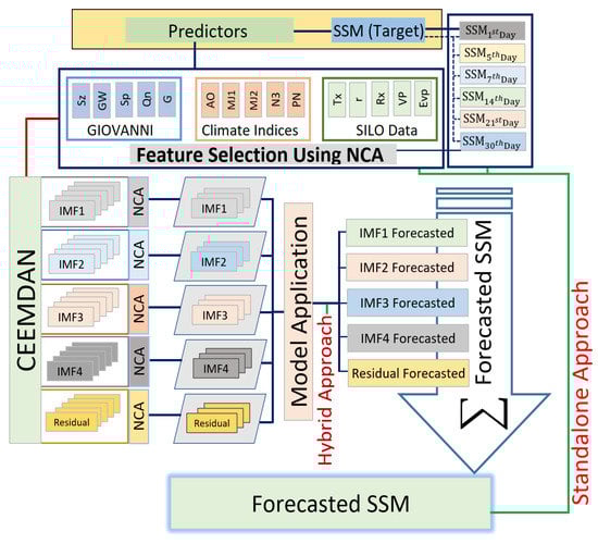 To design a forecast model for SSM over multi-step periods of 1st, 5th, 7th, 14th, 21st, and 30th day lead time, three distinct datasets from satellites (i.e., GIOVANNI), climate indices, and ground source (SILO) for 17 years, 1 February 2003 to 31 March 2020 are used. Hybrid DL is implemented under Intel i7 @ 1.5 GHz and 16 GB memory. The proposed model algorithms were demonstrated using freely available DL libraries, namely the Keras [,] and TensorFlow [] libraries. MATLAB 2020 software is used for Neighbourhood Component Analysis feature selection with packages matplotlib, and Minitab is used to visualise the forecasted SSM in the testing phase.
